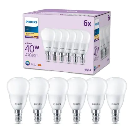 | Fabrikantnaam | Box 6 stuks - Philips LED Kogellamp Mat - 40 W - E14 - Warmwit licht | |